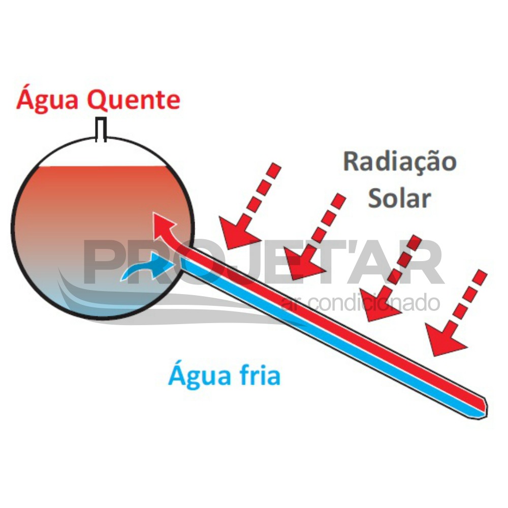O aquecimento da água se dá pelo processo de termo sifão, com base na diferença de densidade entre a água fria fornecida ao sistema e a água aquecida proveniente da troca de calor nos tubos de vidro a vácuo.